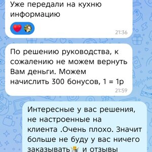 Периодически заказывала тут роллы. Сегодня тоже решила себя побаловать, заказала два ролла, но один из них плавал в масле. Пришлось выкинуть. Так как я в целом была настроена на лояльное отношение к этой компании написала им в поддержку в вк, на что получила ответ что они сожалеют, но деньги вернуть не могут, возьмите 300 бонусов😅 на минутку ролл...