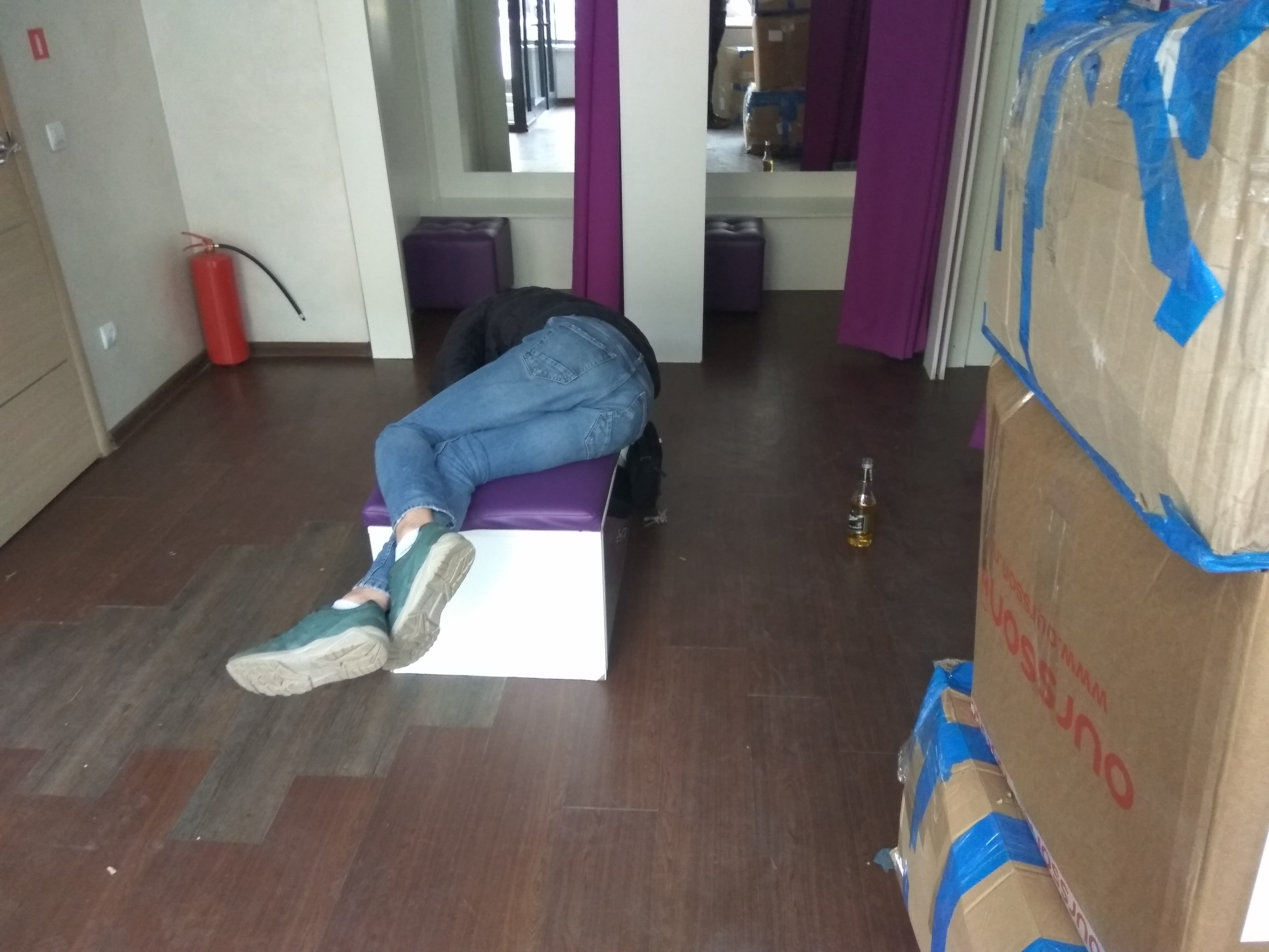 я тоже не поняла... Видела однажды ситуацию, когда человек фигней страдал - лёг просто в обувном на скамейку, пока ждал кого-то.