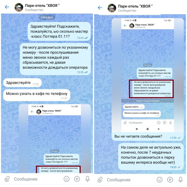 Увидев в группе ВК парка Хвоя пост про квест Гарри Поттера, хотела узнать время и записаться. Позвонила по указанному номеру, прослушала голосовое меню, в котором не было нужного мне пункта. После фразы, предлагающей дождаться оператора, приготовилась ждать - но звонок сбросился. Я звонила ещё несколько раз в течение дня на этот номер и на другой, указанный на сайте парка Хвоя - все попытки закончились одинаково. Сброс звонка после меню.